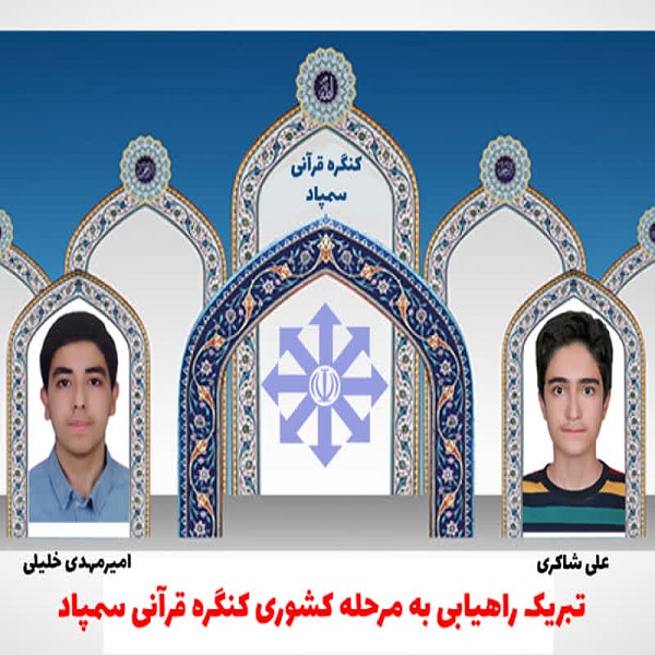 تبریک به دانش آموزان عزیز علی شاکری و امیرمهدی خلیلی به عنوان برگزیده مرحله قطبی مسابقات پژوهش قرآن کریم در کنگره قرآنی سمپاد و راه یافته به مرحله کشوری