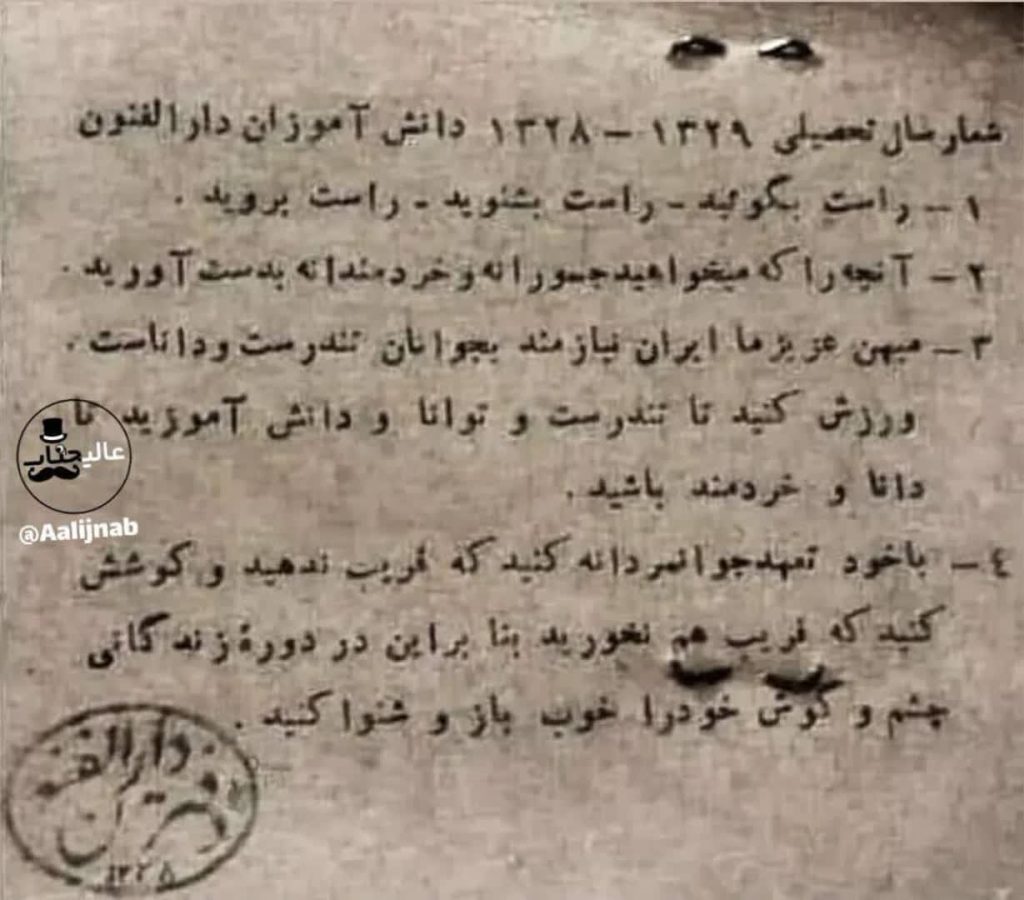 📌پشت کارت دانش آموزی مدرسه دارالفنون، شعار سال تحصیلی دانشآموزان، هفتاد و شش سال قبل: